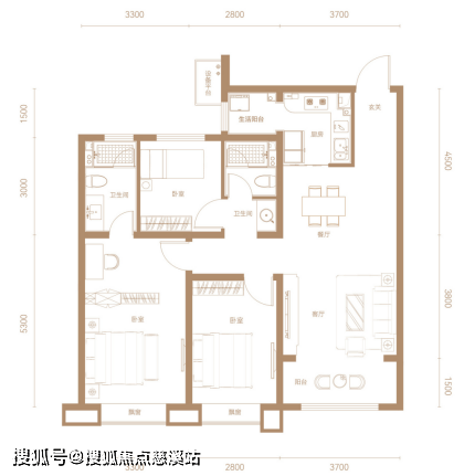 贻成瑞府的115平米的三居室户型,在南北通透的基础上做到了三面采光,在叠加3.05米层高的优势后,室内的明亮度和舒适度显著提升,达成一种特有的“敞透”观感。