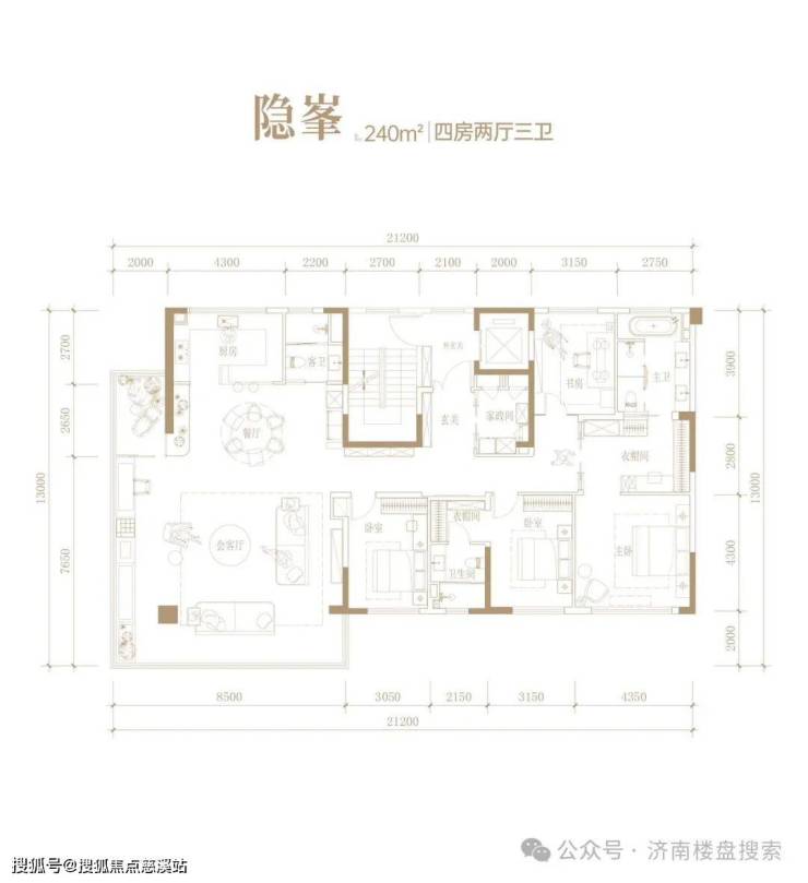 万科观山隐秀户型包含了155、160、188、240平四种,小高层是两梯两户,洋房一梯两户;顶层是复式产品,有200+197平、210+210平、180+180平户型,客厅挑高6米,后期可以进行搭建。