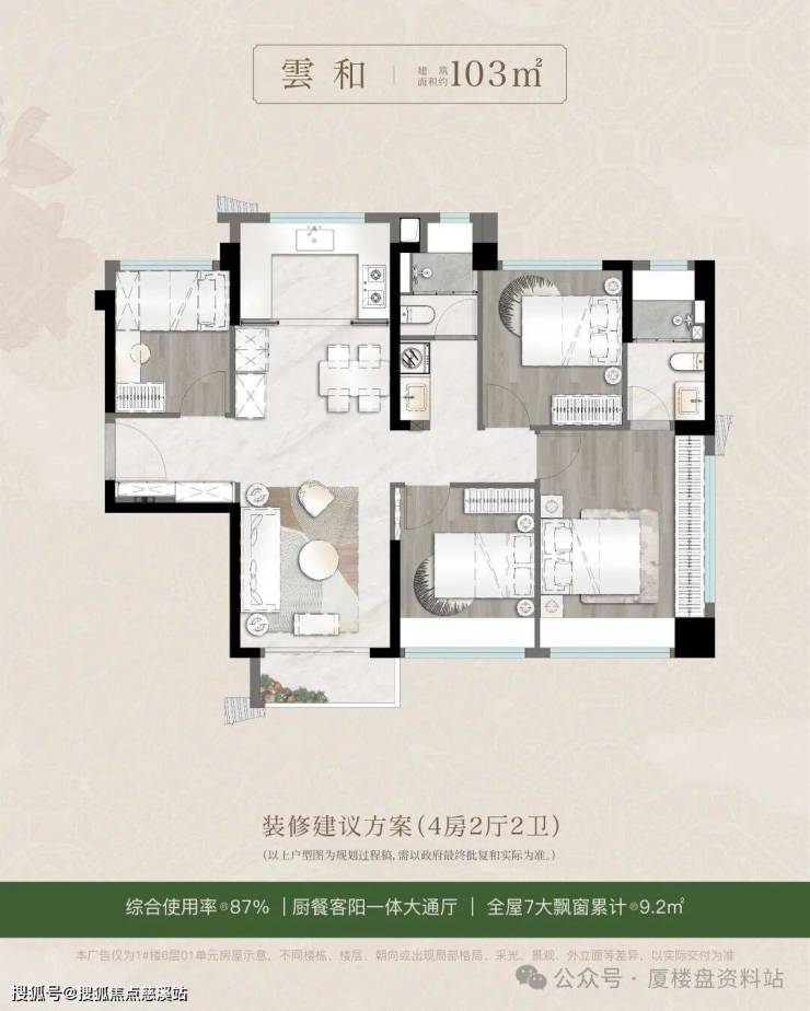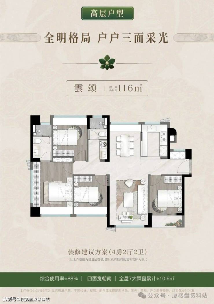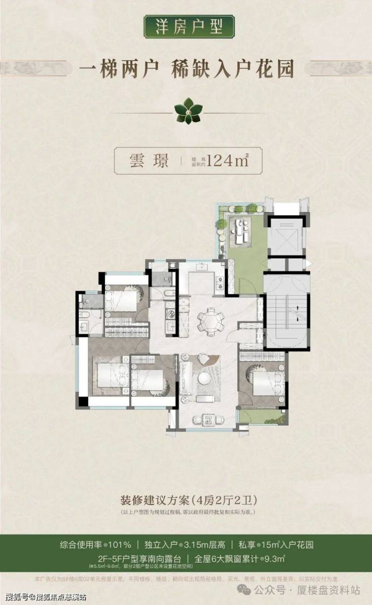 高层95平做三房,103平、116平做四房,86-89%的超高得房率,洋房124平四房,1梯2户,带空中入户花园,2-5层带南向阳光露台,综合使用率101~108%,最大约81米楼间距。