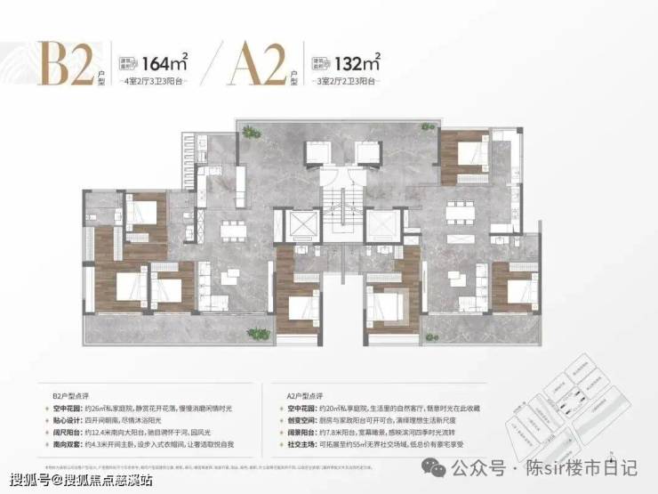 建面约164㎡户型约26㎡庭院+四开间朝南+约12.4米南向大阳台+约4.3米开间主卧+步入式衣帽间。