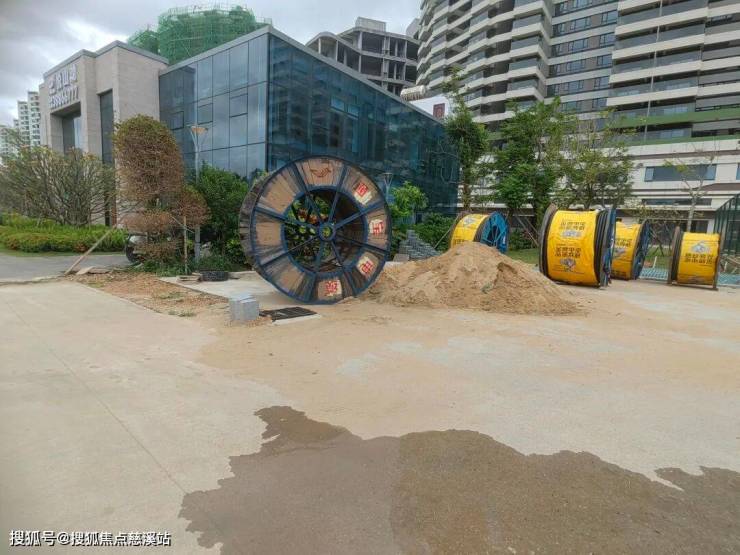 地面上摆放着不少的电缆盘、沙土这些建材,工地里有不少临时围挡,走路得绕着走。