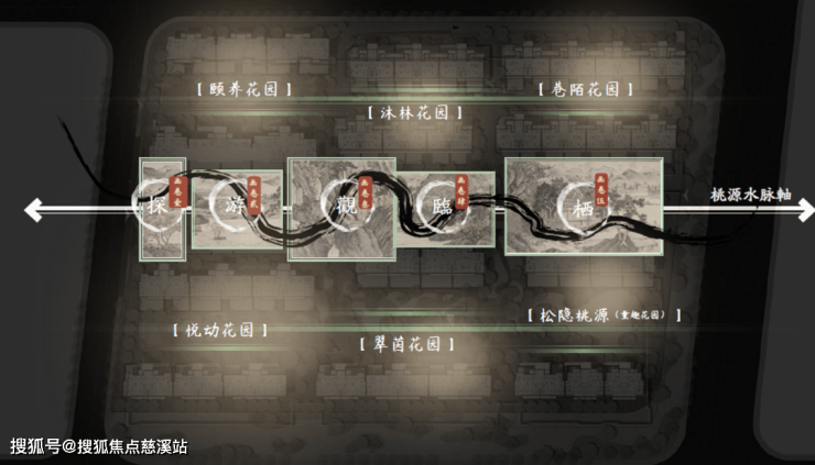 礼序中轴,东西延展,奠定社区空间骨架与仪式格局。它不仅是串联“五进”桃源秘境之旅的主脉络,更巧妙融合传统礼制精神与《桃源问津图》的隐逸意境,于严谨秩序中流淌自然野趣,成为承载归家礼序与桃源栖居理想的核心景观轴线。