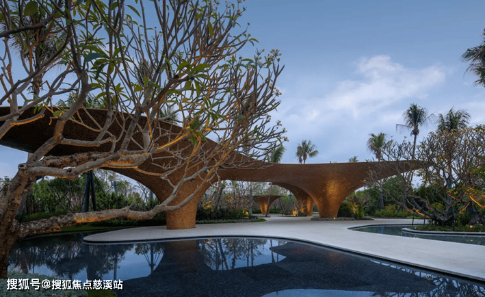 项目邀请42位非遗继承人,耗时35天编制而成的伞状廊架,既提供了遮荫功能,又透出斑驳的光影效果。廊架落客区体现了海岛文化的温润拙朴,也是现代精工和传统手工艺的完美结合。
