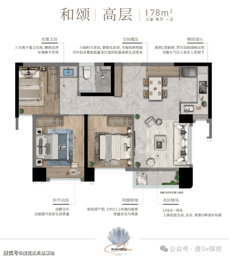 常规的小三房户型做法,没什么特别。