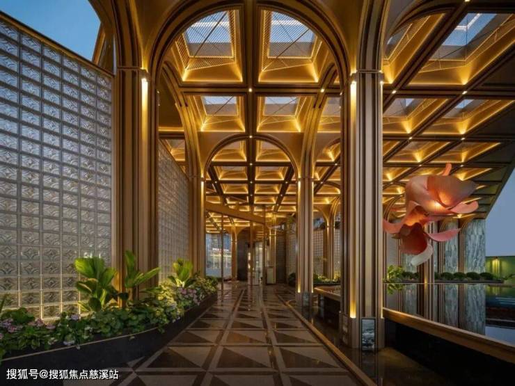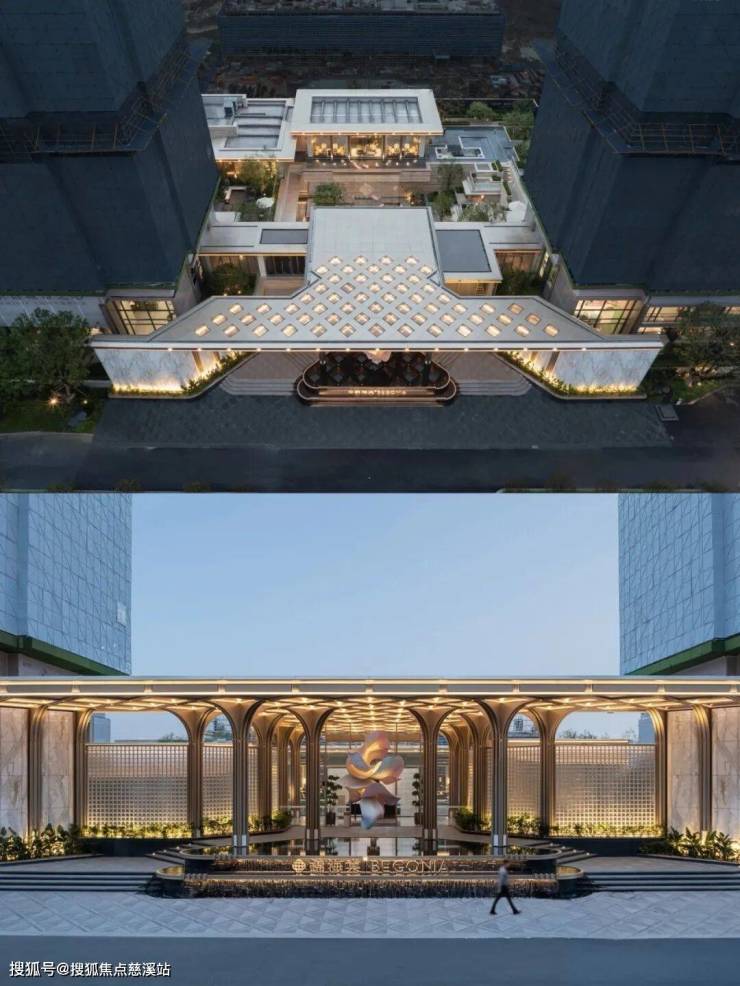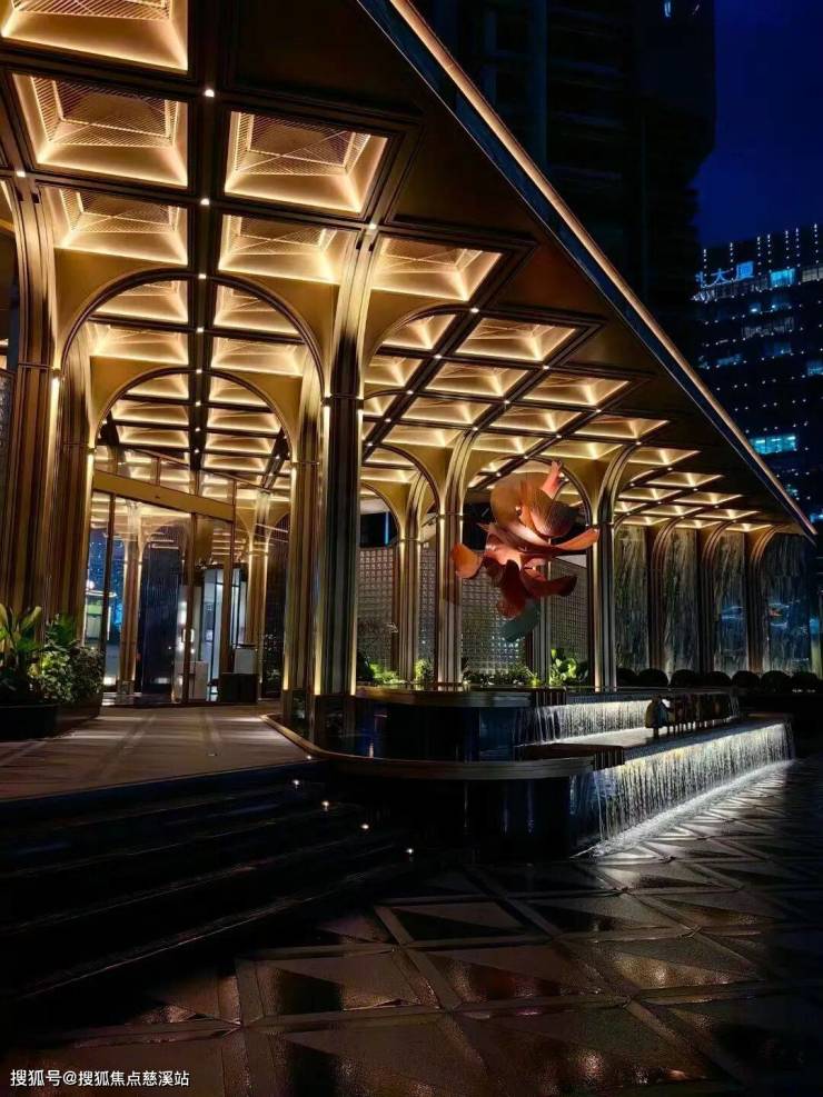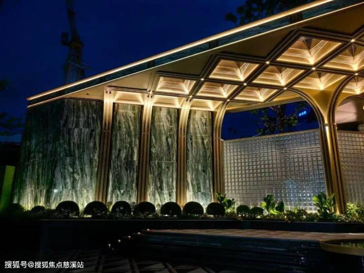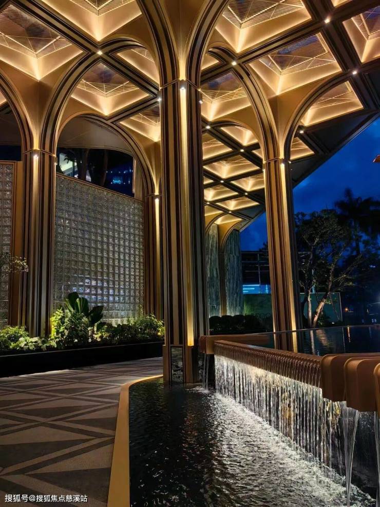 顶部的结构呈现出几何感十足的造型,通过金色的框架和灯光勾勒出精致的轮廓,极具视觉冲击力。结合了金属、石材等材质,金属框架的精致与石材墙面的厚重感形成对比,既体现出现代建筑的精致工艺,又增添了沉稳的质感。巧妙运用暖黄色灯光,在黄昏或夜晚时分,灯光透过建筑结构的缝隙洒出,营造出温馨且富有格调的氛围,使建筑在环境中十分醒目。