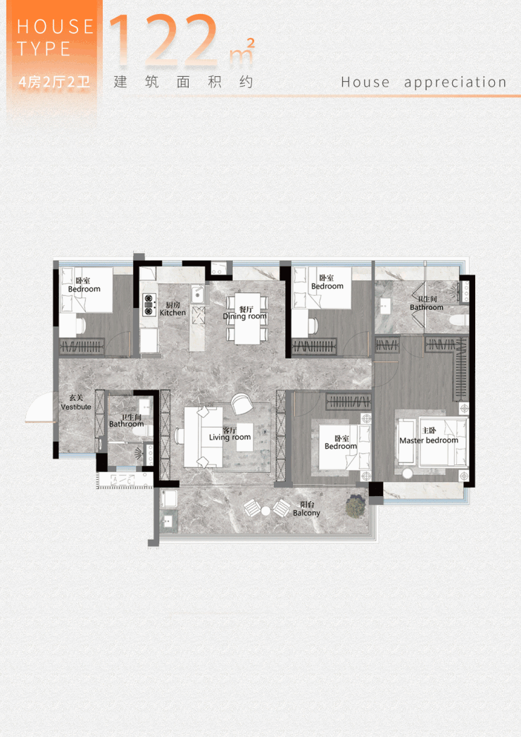 全新迭代超新规128㎡户型,四房两厅两卫 ;
