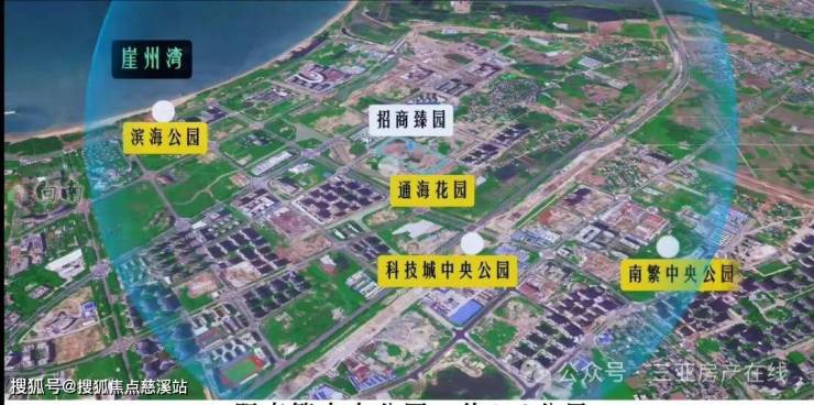在公共休闲配套方面,规划待建设的通海花园就位于招商臻园项目的东侧,距规划带建设的科技城中央公园约1.5km,距已经建成的崖州湾沙滩滨海公园约1.7km,距南繁中央公园约1.8km。