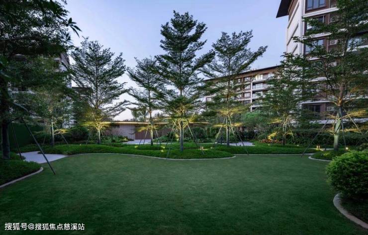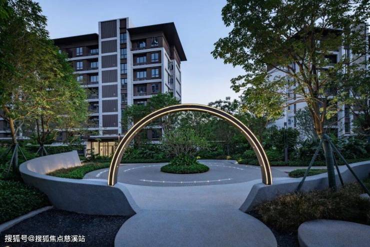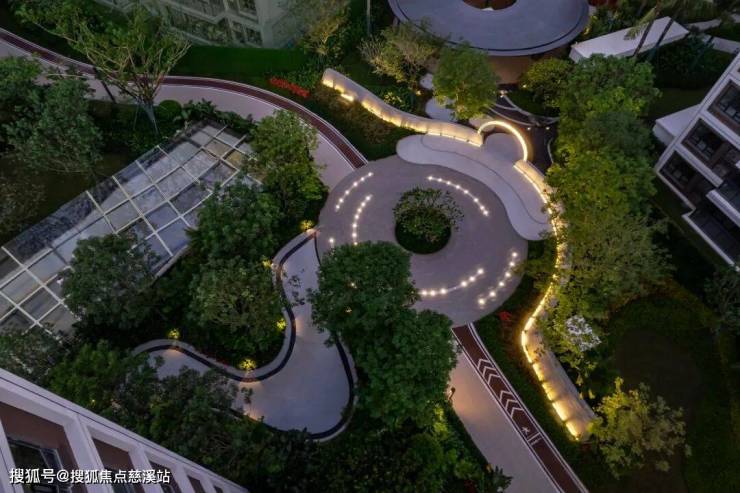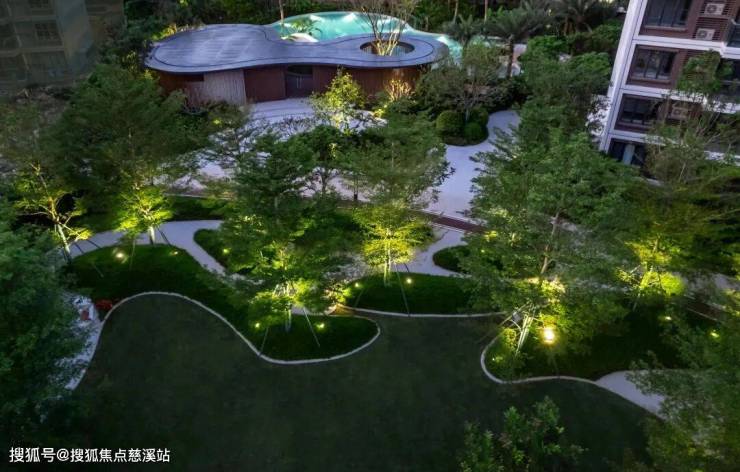 项目设计的核心理念在于严谨且克制的空间逻辑,穿过入口星光门进入花园会客厅,抬眼便可看到轻盈构筑被绿油植被包裹着,整体的自然森境氛围感在植被的映衬下营造得当。