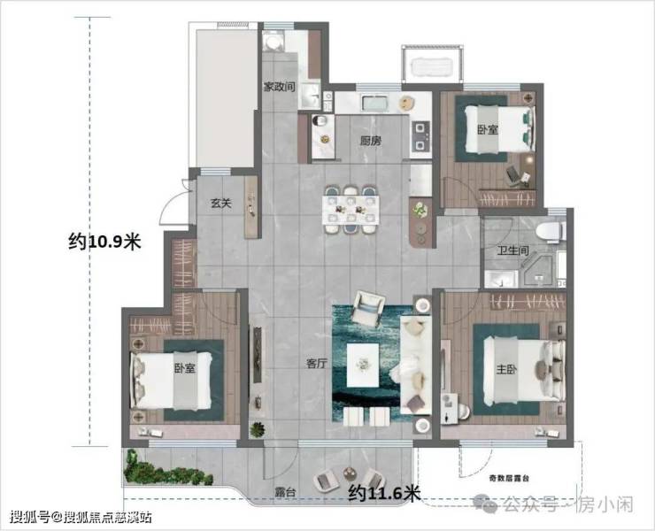以宜禾•春江府116平米户型为例,三室两厅的格局,不算露台的整体进深做到了约10.9米,整体开间做到约11.6米。非常经典的大面宽、短进深布局,将薄、透、通的四代户型产品特点做到了极致。