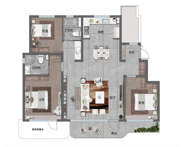 客厅和次卧之间的隔墙可拆,打通后实现约7.45米IMAX尺度超幕宽厅,搭配南侧270度超大尺寸观景露台,成就一种独栋别墅才具有的“府邸”居住感受。