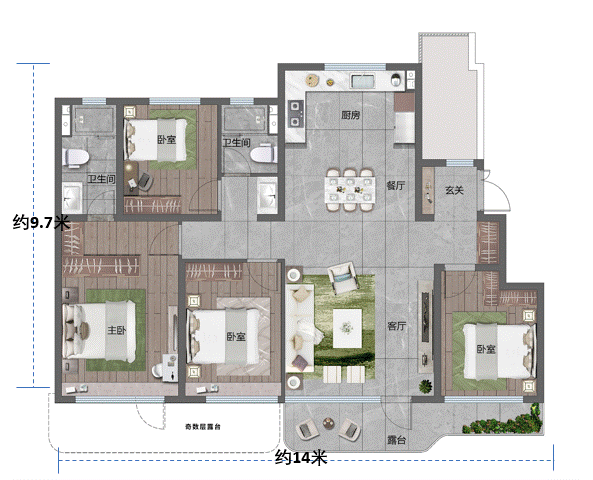 这个四居室户型的南向面宽达到奢侈的约14米,在片区中少有产品能够匹敌。不计露台的进深却只有约9.7米,想象一下它未来阳光满屋、视野无界的的居住感受,只能用奢享来形容。