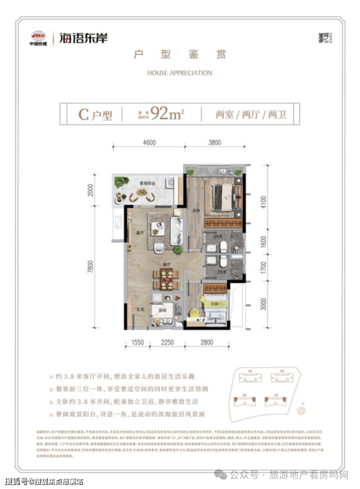 C户型:建筑面积约92㎡,两室两厅两卫。方正布局,功能分布科学合理,约3.8米客厅开间;餐客厨三位一体,室内通透、采光通风良好;主卧约3.8米开间,配备独立卫浴,静享雅致生活奢阔观景阳台。