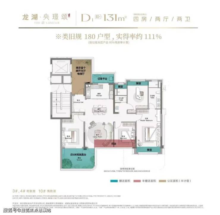 ·建面约131㎡洋房:四房两卫设计,南向面宽优越,空间利用率高。