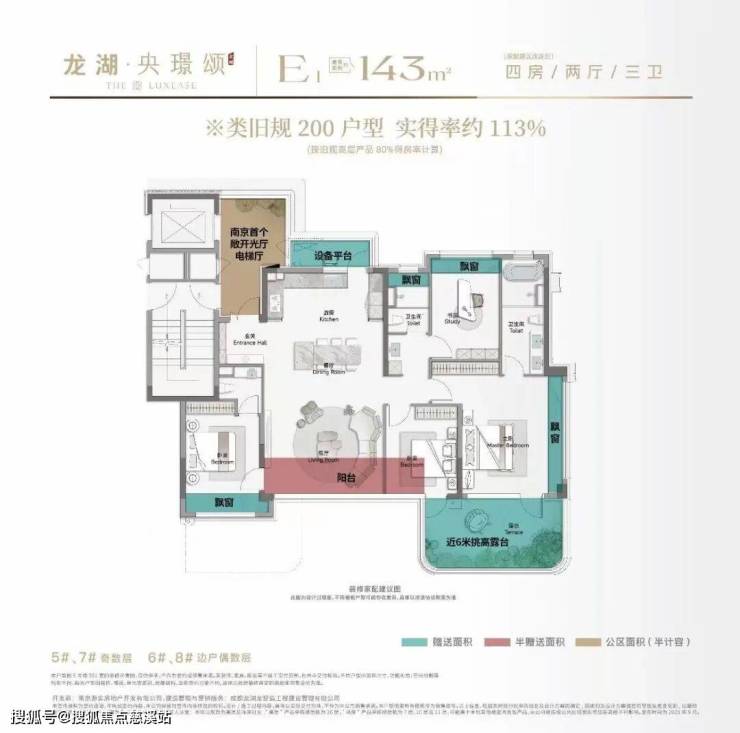 ·建面约143㎡洋房:南向面宽约16米,主卧开间约4.25米,采用三套房设计,并连接近6米挑空露台。