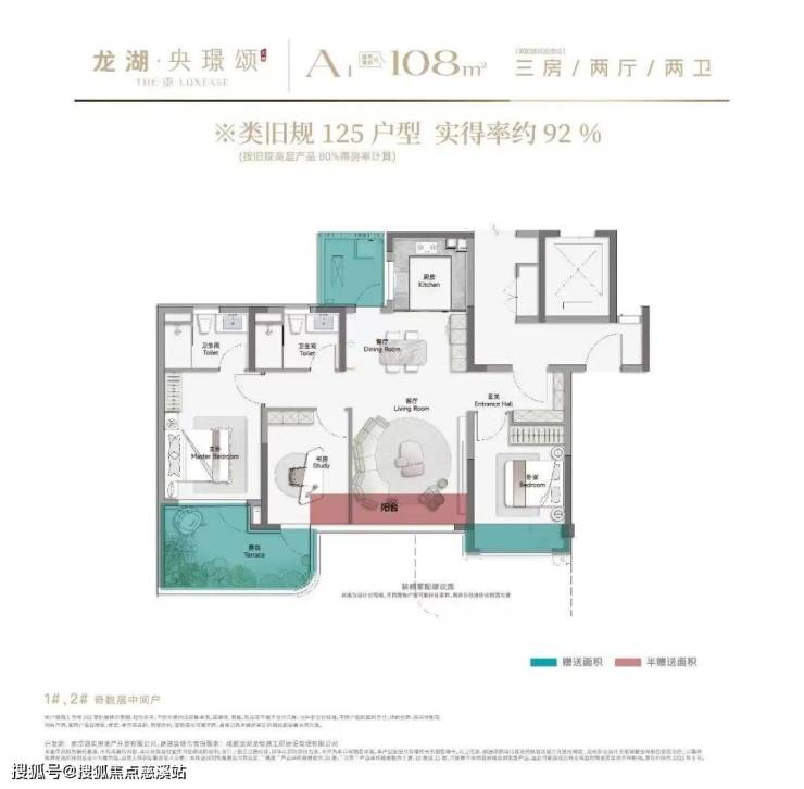 ·建面约108㎡高层:三房两卫设计,南向四开间,带挑空露台,适合首置或刚改家庭。