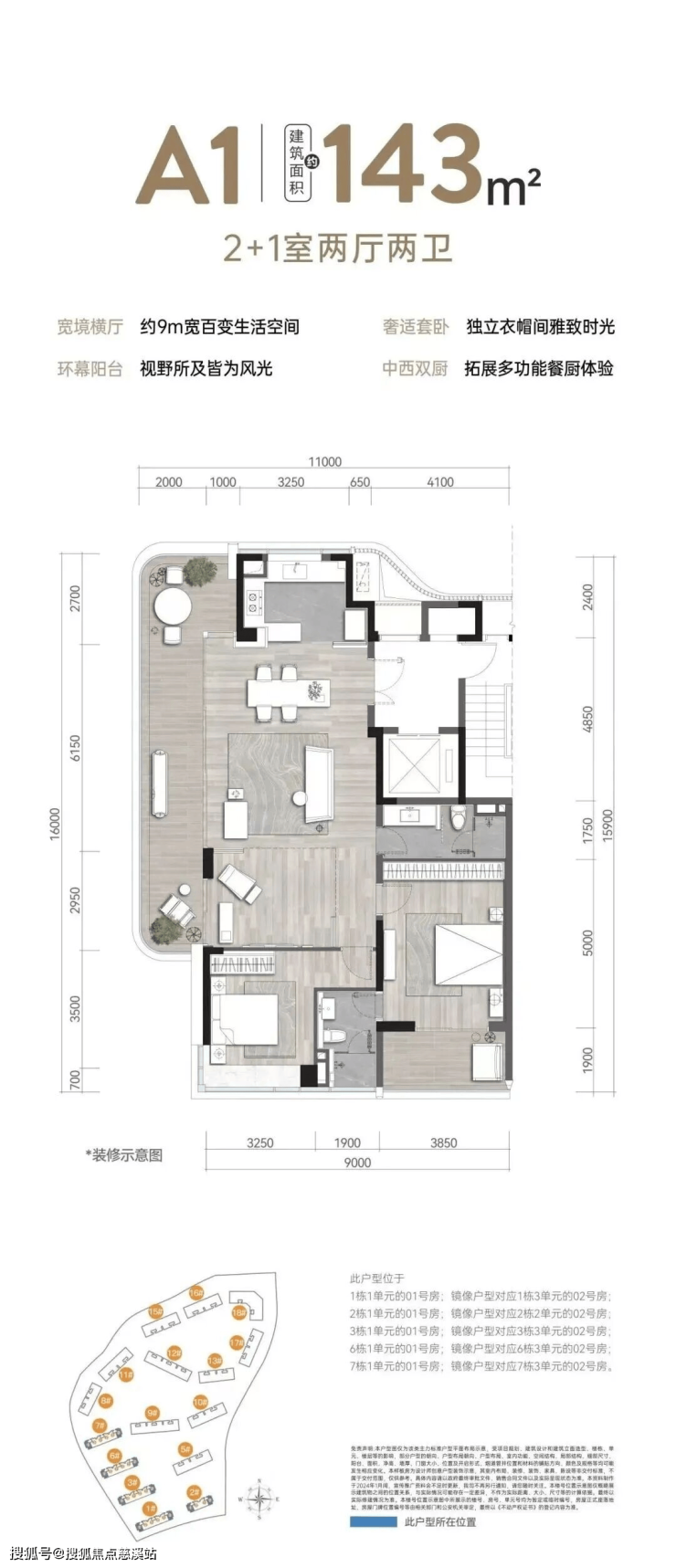 :约 9m 宽境横厅,解锁百变生活场景;环幕阳台设计,视野所及皆风光;奢适套卧带独立衣帽间,私享雅致时光;中西双厨配置,拓展餐厨功能体验。