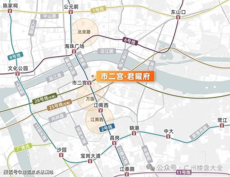 项目跟市二宫地铁站直线距离仅约80米,步行距离200米不到。北侧与珠江边直线距离约500米,而且沿着江南大道直上海珠桥,一江之隔就是越秀区,离海珠广场、北京路等老牌商圈都非常近。