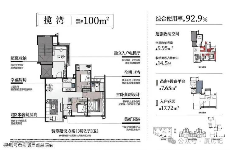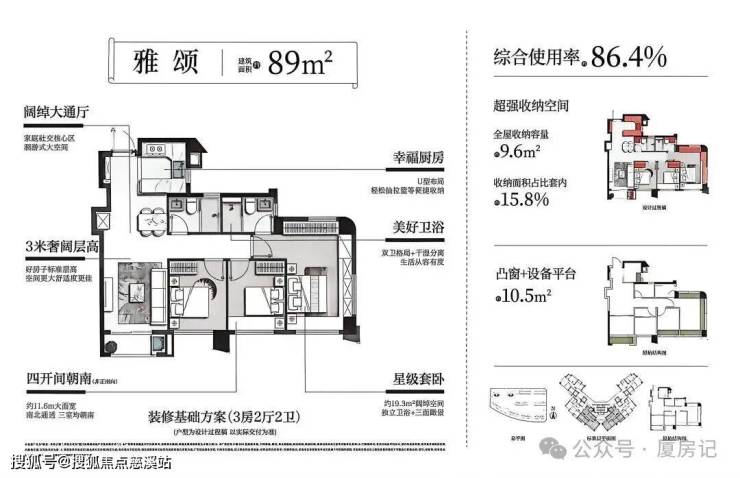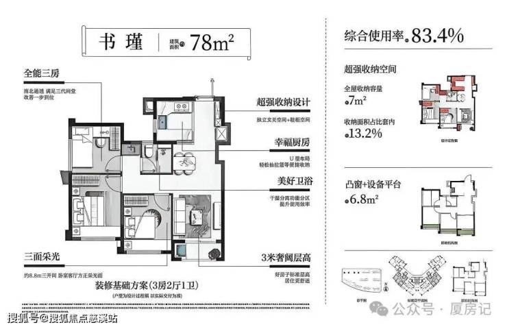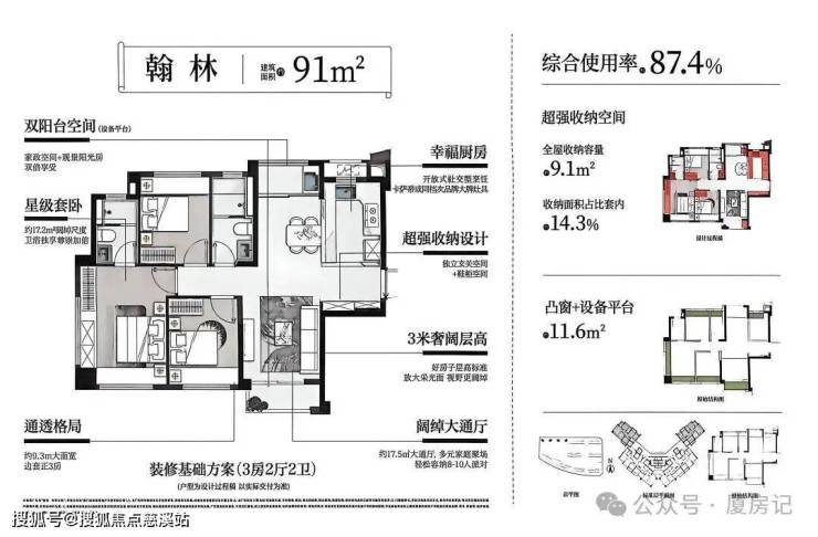 •主打78㎡、89㎡、91㎡三种三房户型,得房率高,分别为83.4%、86.4%、87.4%左右;