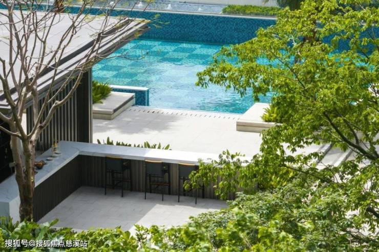 步入核心景观,大面积泳池美景尽收眼底。极简的线条,于青绿与淡蓝的肌理变化中,为空间增添几分力量的稳重与宁静的透彻。