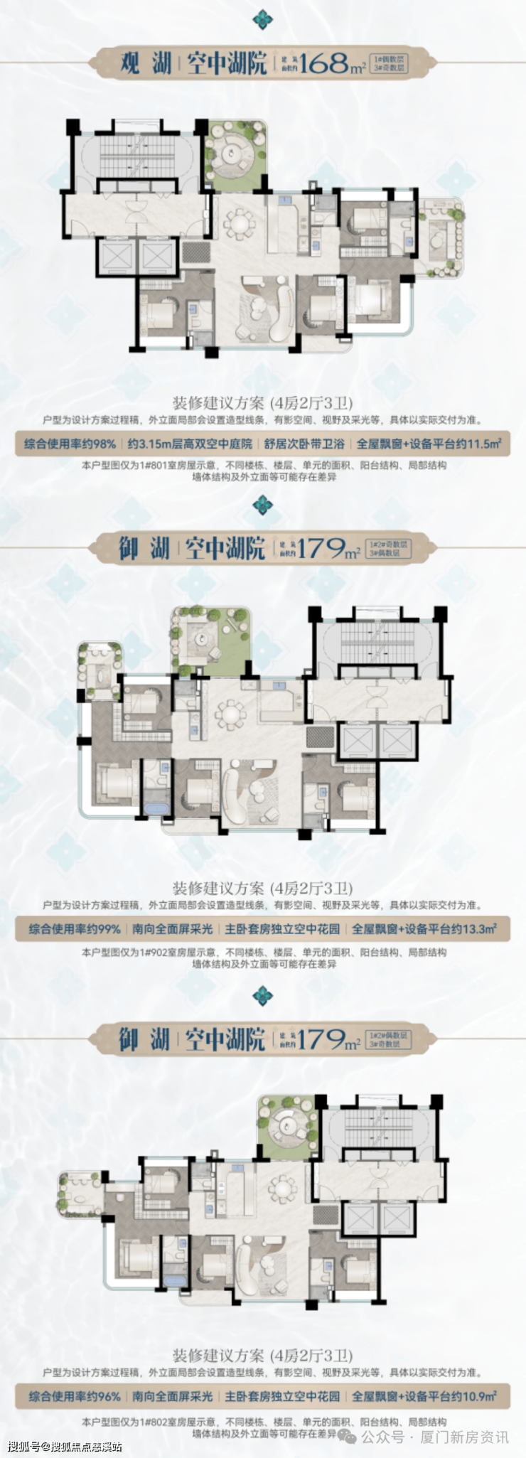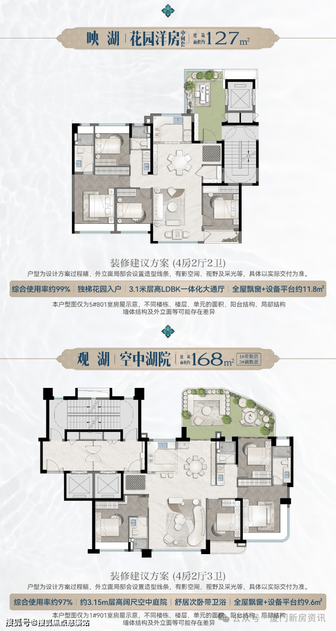 产品建面约125㎡洋房,一梯两户,瞄准的是中产改善,这也是岛东首个户户空中花园+得房率100%+一线亲湖的低密洋房。宸启瑞湖的四代宅湖景空中墅起步245㎡,而建发望湖168-179㎡四代宅,湖景享受、露台花园、空间使用率基本一致,门槛更低,和瑞湖有效形成产品差异化,纯改善的产品定位,一起拔高环湖圈的改善价值,增加市场认可度。