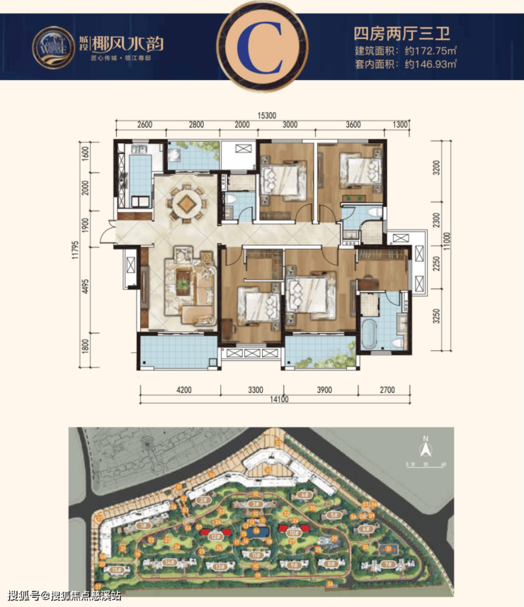 C户型:建面约172.75㎡四房两厅三卫