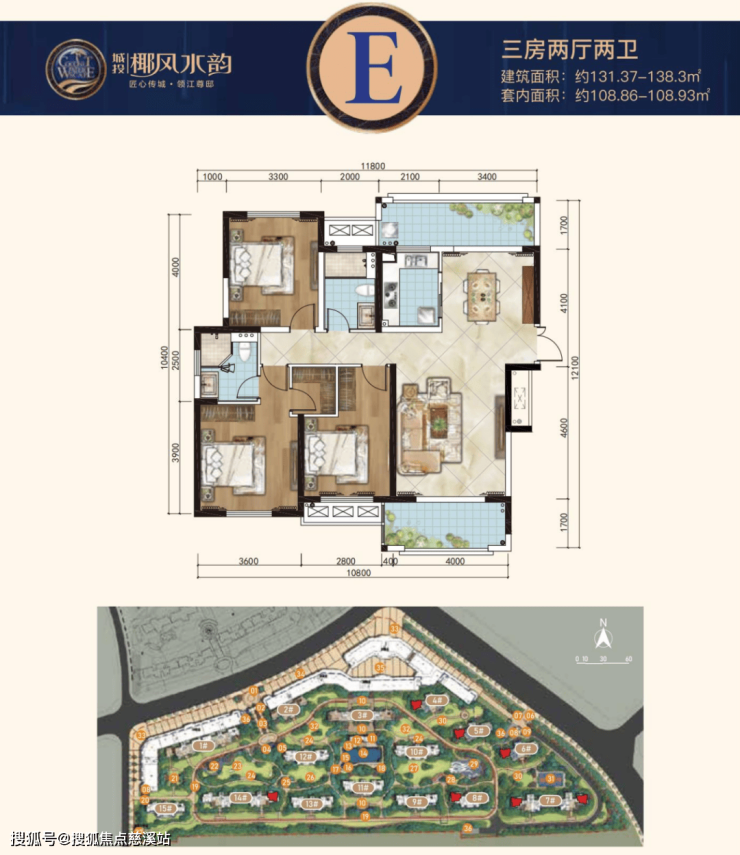 E户型:建面约131.37-138.3㎡三房两厅两卫