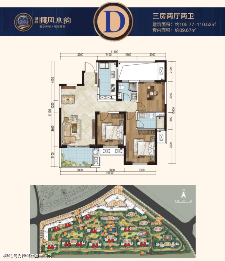 D户型:建面约105.77-110.52㎡三房两厅两卫