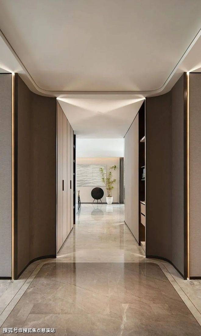 天花板和墙壁采用了圆润的弧线设计,而地面则选用了丝云灰石材,并巧妙地拼接成花纹。