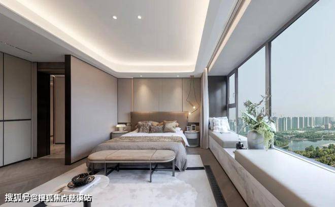 卧室区域采用丰富的材料种类(包括石材、实木、皮革硬包、墙纸、古铜不锈钢、丝网印刷玻璃等),在各种材质之间,广泛使用了超窄金属条进行收口处理,这不仅凸显了工艺的精细,也提升了空间的高雅气质。