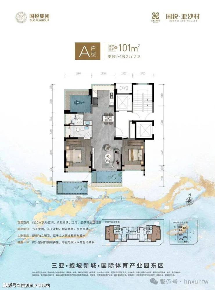 国锐·亚沙村六大价值亮点🌟项目由18栋小高层和约3.3万方商业街区组成,是以居住功能为主,集商业、生活配套、体育康养等功能为一体的度假生活城,致力打造三亚新城旅居度假新标杆。