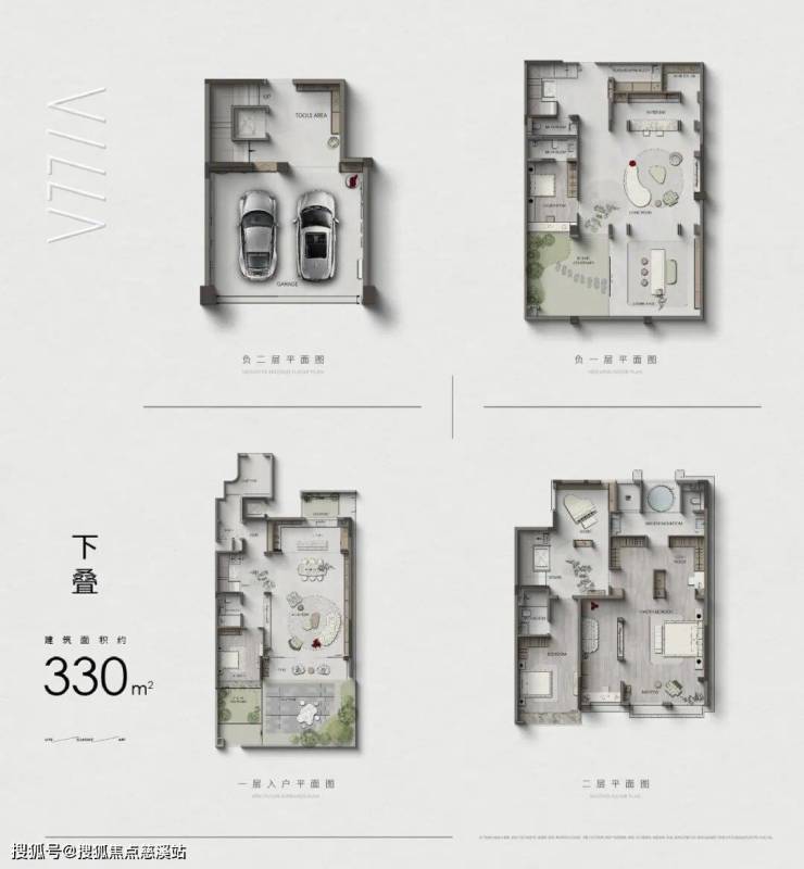 建面约330㎡下叠,共4层,三重入户方式(南北入户,地下二层入户),一层有花园,负一层有挑空庭院,独立车库