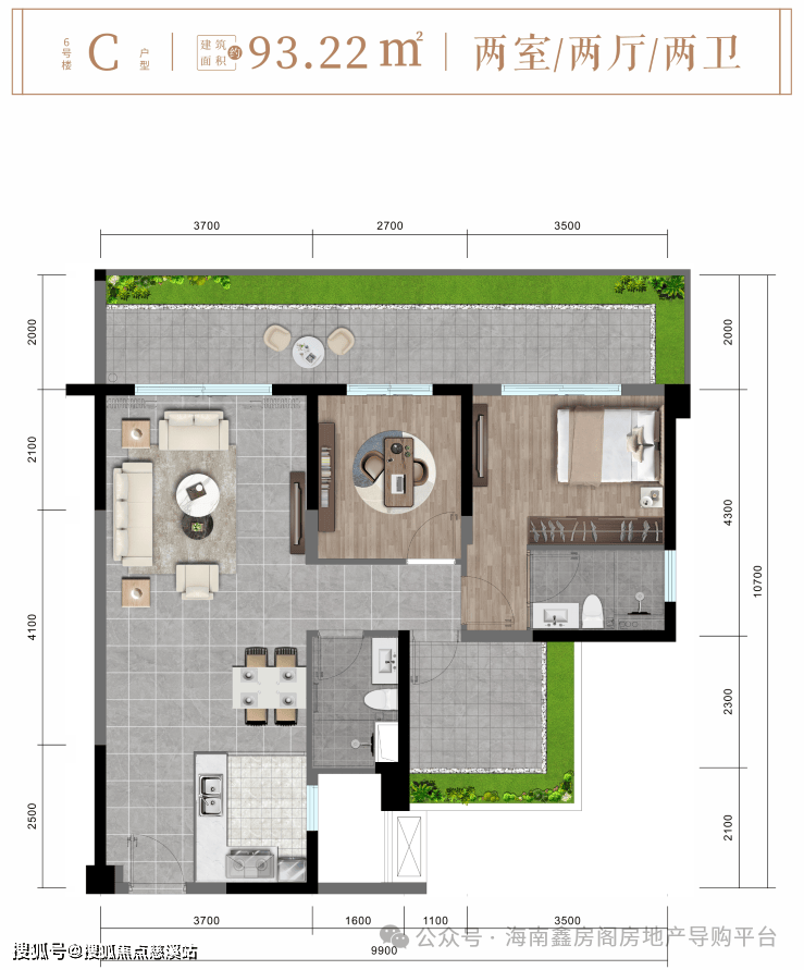 C户型约93㎡舒阔两房两厅两卫