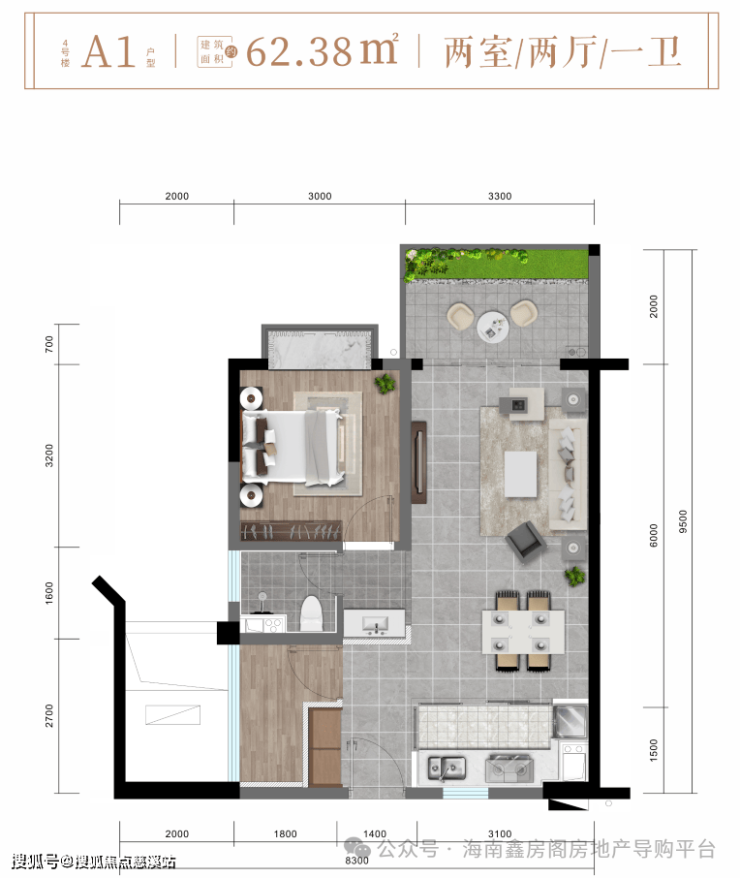 A1户型约62㎡精致两房两厅一卫