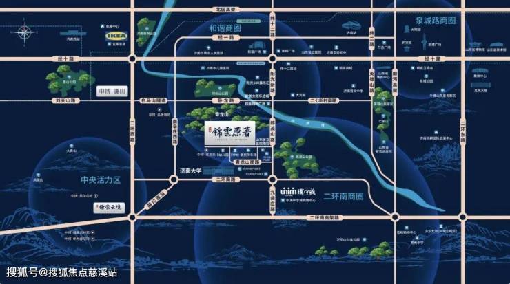 中博·锦雲原著的位置在济南大学北侧,项目东、北、西三面环青龙山,中博·锦雲原著坐落于山之南麓,山南一侧的日照充足、植被茂密,是济南市罕有位于山之南麓的豪宅住区。