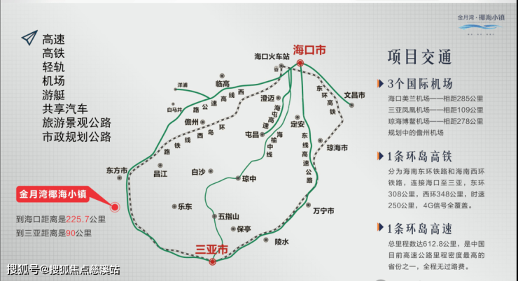 项目出发7分钟即可到G98环岛高速,一小时到三亚!10分钟可到达尖峰互通高速口