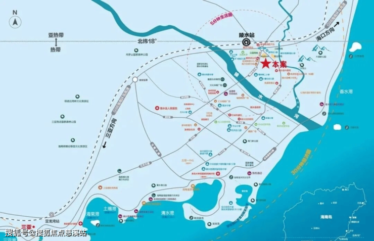 陵水位于海南岛东南部,拥享118.57公里优美海岸线,“三湾三岛两湖一山一水”,北纬18度以南稀缺且珍贵,项目位于陵水椰林北大道和桃源大道交汇处,是市政城市更新“一河两岸”的核心位置。