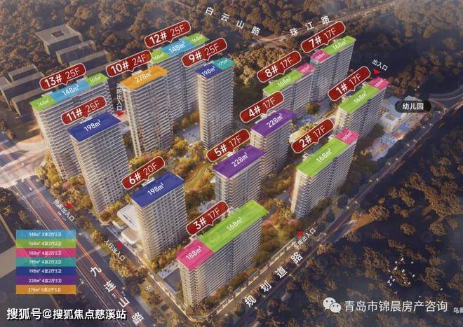 根据规划指标,唐岛湾君汇项目占地面积60040㎡,建设17栋建筑,总建筑面积223433.21㎡(地上总建筑面积156923.21㎡,地下总建筑面积66510㎡),容积率2.6,绿地率30%,建筑密度24%,停车位数1506个,共790户。来看看唐岛湾君汇的分布图,最低17层,最高25层,给人的第一感觉确实是挡光+压抑