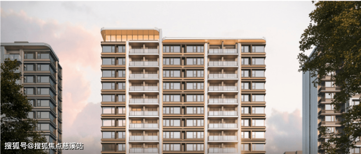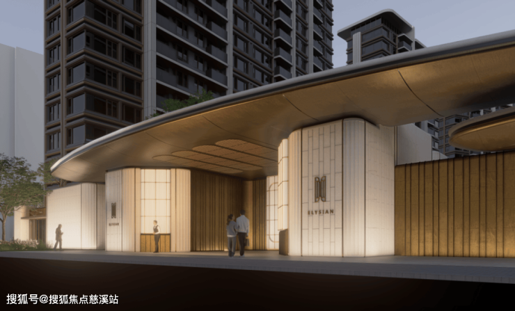 蓝灰色玻璃+仿石铝板+艺术涂料材质,穿插优雅线条,让建筑这张“脸”看起来更高级。One&Only酒店式门头。用雕塑体块、温润弧面和雅致线条,营造具有艺术格调的归家仪式感。