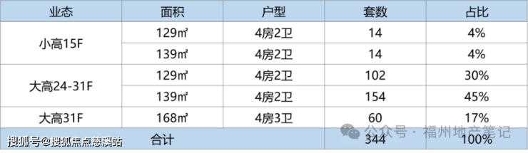 首改、改善户配,129-139㎡占比83%、大户型168㎡户型仅占比17%。车位配比1:1.25。