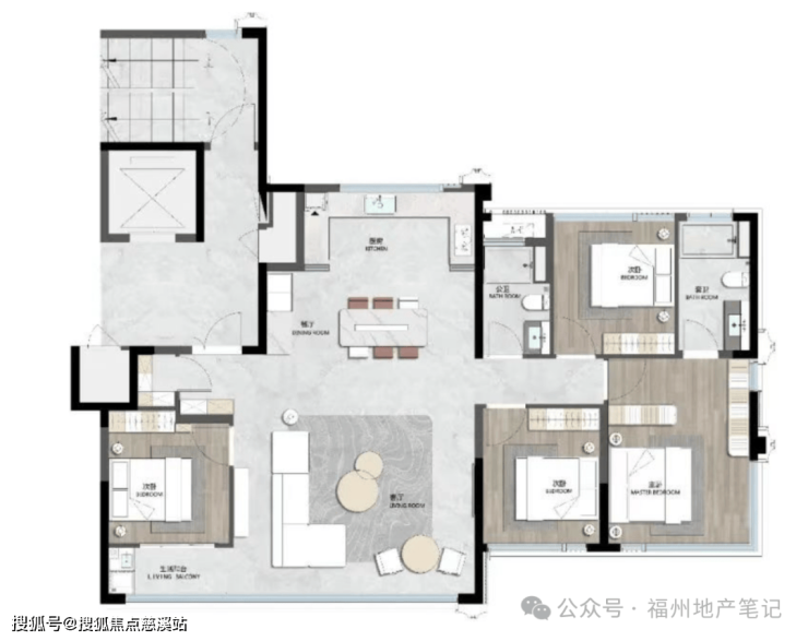 户型类四叶草布局,节省过道面积,空间使用率提高,客餐一体空间视感强。