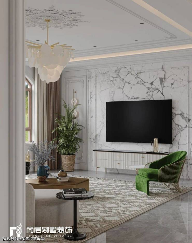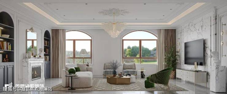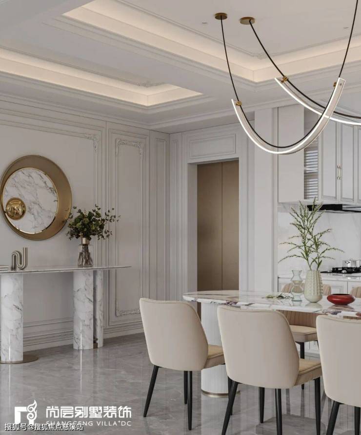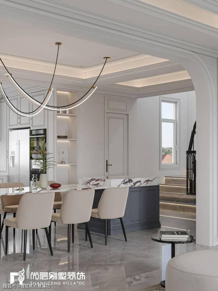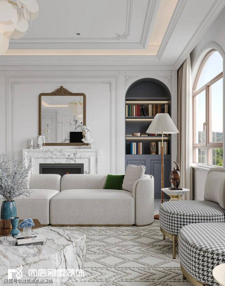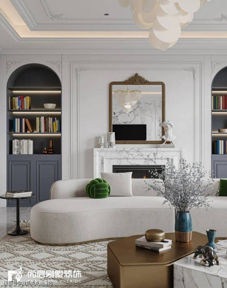 大理石瓷砖、艺术雕塑、欧式壁炉、镜框等细节的刻画,淡雅而高级的灰白色调,搭配复古感十足的肌理PU石膏线条,摒弃传统法式的繁复、冗杂,还原最真实的质感,营造出宁静舒适的居住感受。