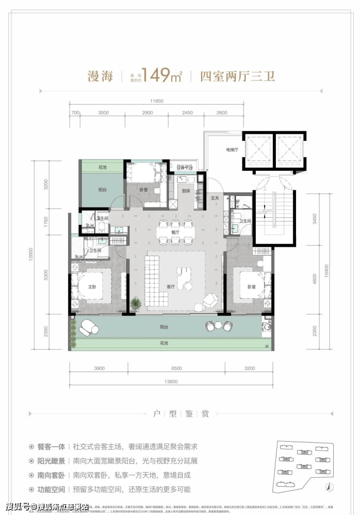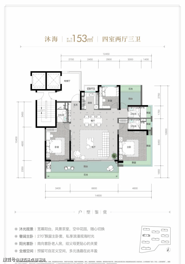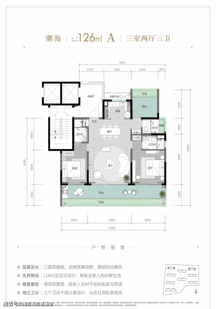 规划建筑面积约126-213㎡观海奢装大平层,约3.1米阔绰层高,部分户型创新设计270°全景飘窗主卧套。