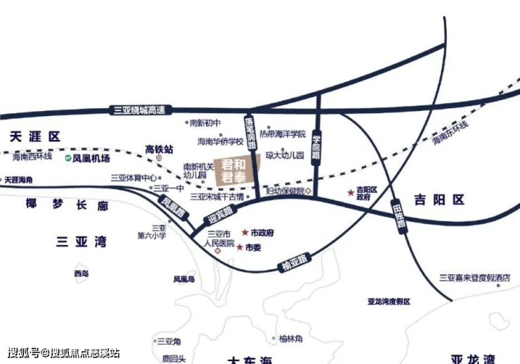 君和君泰项目位于三亚环城高速荔枝沟出口处(琼州学院对面),属于政府重点规划的月川—荔枝沟—抱坡岭片区,该区域重点规划定位为文化教育、商业贸易核心区;由学府教育区、公共服务区、行政商务区、生活配套区、文化商业区及品质居住区所组成。