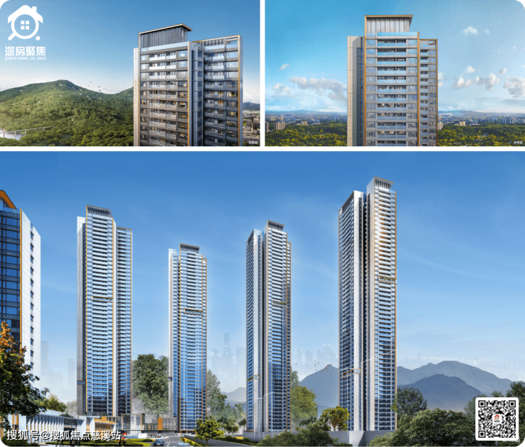 『深铁珑境花园二/三期』建筑采用现代简约立面风格,主要材料为铝板+双层LOW-E玻璃+铝合金系统门窗+局部涂料,近几年深圳改善盘大都使用的这个配方,整体审美和质感在线。