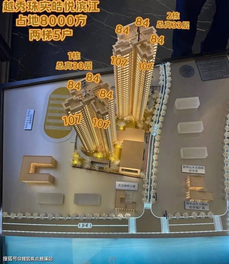 2栋超高层住宅(30-33层),仅300套房源,容积率3.5+,主推84-107㎡全南向三四房,高楼层部分单元可望珠江及二沙岛、小蛮腰景观。