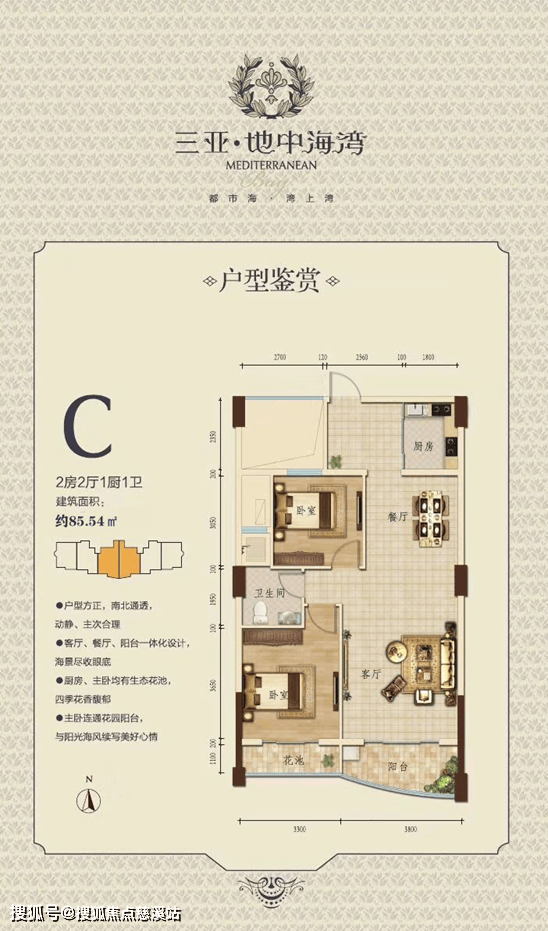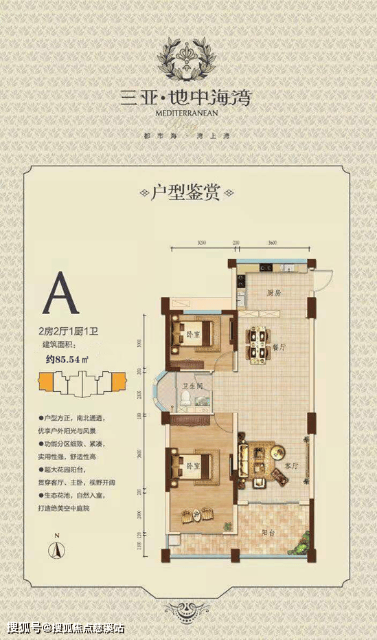 A户型:建筑面积约85.54平米,两房两厅一厨一卫,户型方正,南北通透,功能区划分细致,实用性强,超大花园阳台,贯穿主卧、客厅,景观入室,生活与自然浑然天成;