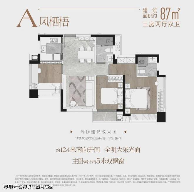 项目主打的87-120㎡三至四房户型,每一个都经过精心设计,力求在有限的空间内创造出无限的可能。87㎡的三房两卫户型,公摊仅约11%,实际使用面积高达77㎡,空间利用率极高。四开间朝南的设计,让南向总面宽达到约12.4米,阳光与风景尽收眼底。主卧三面采光,搭配南侧和东侧两个飘窗,累计约5米的采光面,让居住者仿佛置身于自然之中。