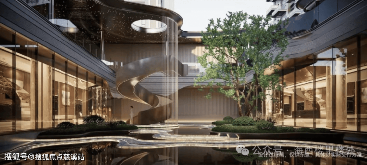 外立面:米黄色大理石+深色大理石+香槟色铝板+通透玻璃幕墙,造型上采用超流体全面屏立面与270°环幕视野飘窗。
