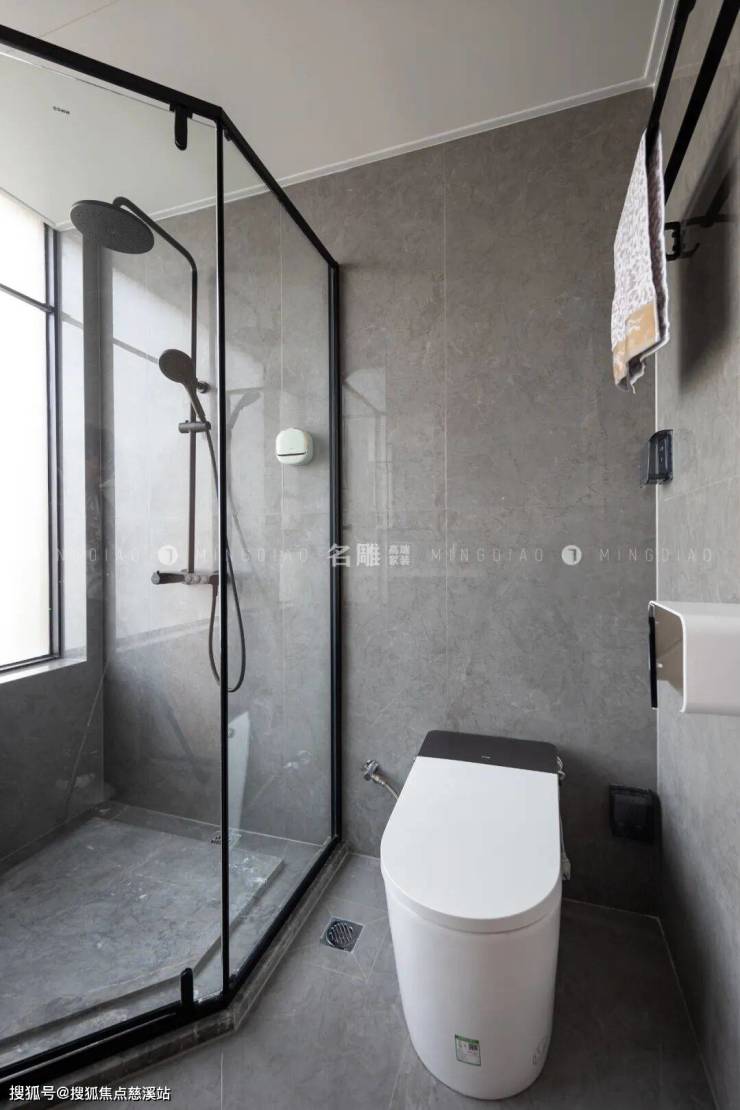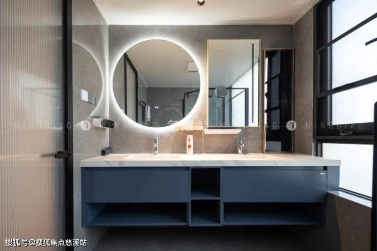 明亮优雅是卫浴间的主旋律,地、墙均采用灰色瓷砖铺设,整个空间温馨又干净简约,白色台面与柔光镜相互映衬,散发出舒缓的光线,展露出高品质的生活格调。