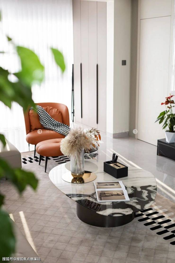 爱马仕橙皮面休闲椅环抱舒展,和花艺摆件、绿植平衡了空间的色彩温度,界限分明却又自然融合。